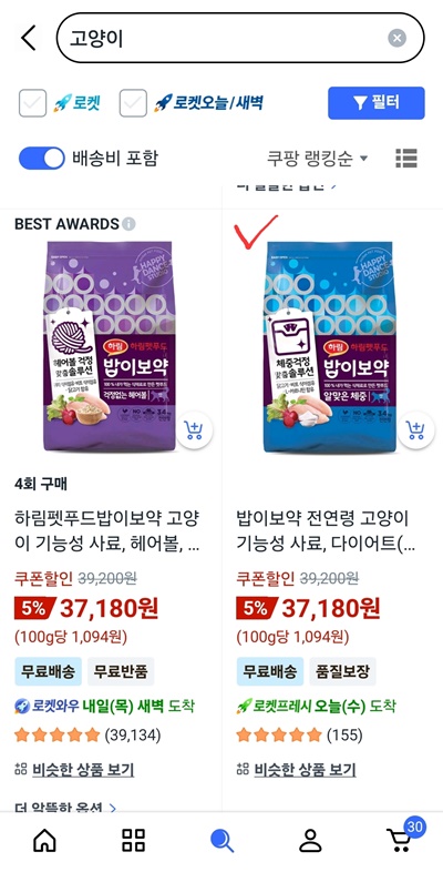 쿠팡에서 고양이를 검색했더니 제가 자주 구매하는 고양이 사료가 나왔습니다.