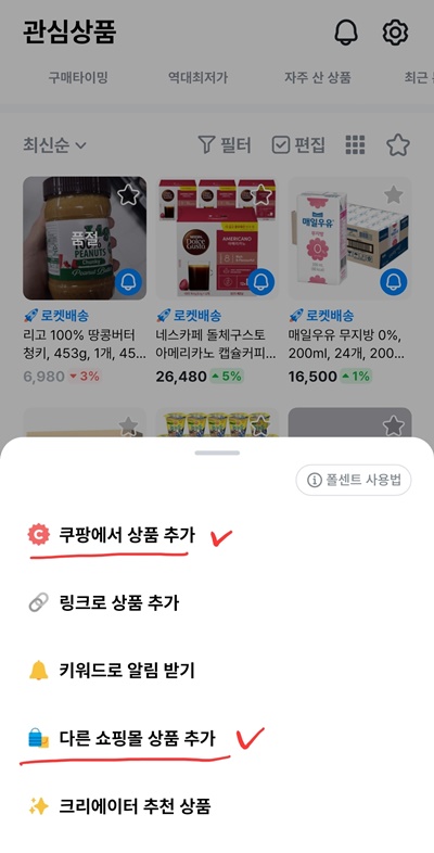 저는 이 앱으로 쿠팡에서 자주 구매하는 제품을 등록해 둔 다음 원하는 가격 근처에 왔을 때 구매하곤 합니다.
