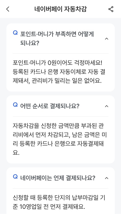 그리고 네이버포인트가 차감은 관리비 자동결제 설정일 10일 전이 미리 실행되기 때문에 네이버포인트가 부족해서 차감되지 않아도 문제없습니다.