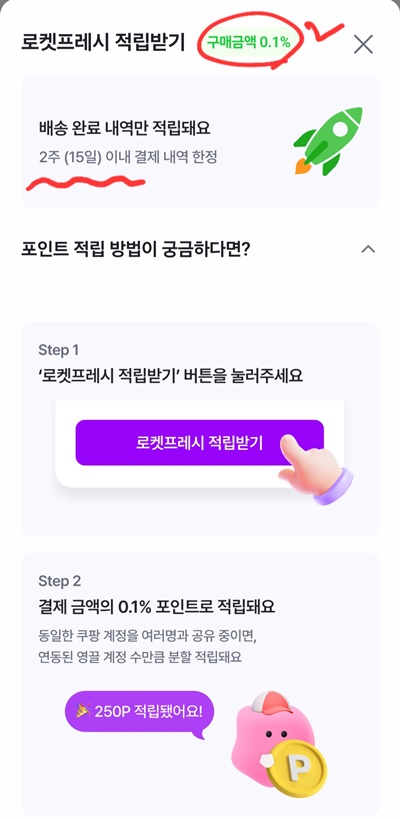 마트, 편의점, 슈퍼 이외에 쿠팡 로켓프레시 구매 영수증도 올리시면 결제금액의 0.1% 적립받을 수 있습니다.